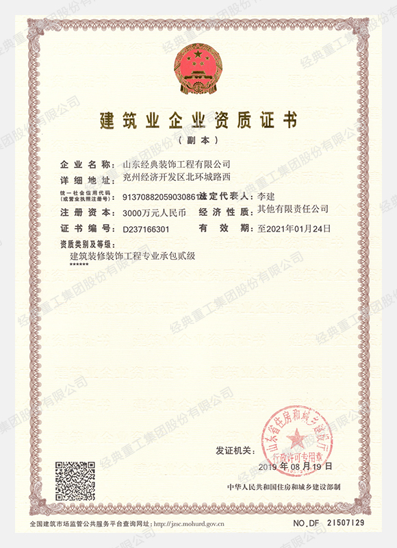 • 建筑裝修裝飾工程專業承包貳級