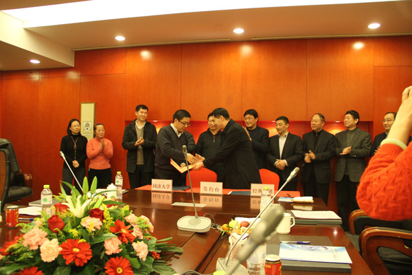 1月18日下午,我公司與同濟大學舉行長期戰略合作協議簽約暨授牌儀式在會議室隆重舉行。集團公司苗樹文董事長與同濟大學土木工程學院李元齊教授簽署“關于經典集團與同濟大學合作意向協議書”,并向李教授頒發了聘書。出席此次會議的有市委常委宣傳部部長初建偉,開發區主任周廣全,發改局劉局長,經信局韓局長,科技局周局長,國土資源局王局長等。會議由上海市科技成果轉化促進會秘書長姚偉民主持。